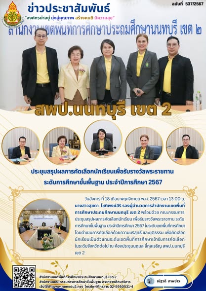 วันอังคาร ที่ 18 เดือน พฤศจิกายน พ.ศ. 2567 เวลา 13.00 น. นางสาวสุชดา โชติพงษ์สิริ รองผู้อำนวยการสำนักงานเขตพื้นที่การศึกษาประถมศึกษานนทบุรี เขต 2 พร้อมด้วย คณะกรรมการประชุมสรุปผลการคัดเลือกนักเรียน เพื่อรับรางวัลพระราชทาน ระดับการศึกษาขั้นพื้นฐาน ประจำปีการศึกษา 2567 ในระดับเขตพื้นที่การศึกษาโดยดำเนินการคัดเลือกด้วยความบริสุทธิ์ และยุติธรรม เพื่อคัดเลือกนักเรียนเป็นตัวแทนระดับเขตพื้นที่การศึกษาเข้ารับการคัดเลือกในระดับจังหวัดต่อไป ณ ห้องประชุมนฤมล ลี้กุลเจริญ สพป.นนทบุรี เขต 2