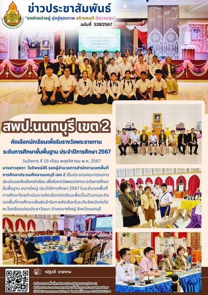 วันอังคาร ที่ 19 เดือน พฤศจิกายน พ.ศ. 2567 นางสาวสุชดา โชติพงษ์สิริ รองผู้อำนวยการสำนักงานเขตพื้นที่การศึกษาประถมศึกษานนทบุรี เขต 2 เป็นประธานคณะกรรมการประเมินและคัดเลือกนักเรียน เพื่อรับรางวัลพระราชทาน ระดับการศึกษาขั้นพื้นฐาน ขนาดใหญ่ ประจำปีการศึกษา 2567 ในระดับเขตพื้นที่การศึกษาโดยดำเนินการคัดเลือกนักเรียนเพื่อเป็นตัวแทนระดับเขตพื้นที่การศึกษาเพื่อส่งเข้ารับการคัดเลือกในระดับจังหวัดต่อไป ณ โรงเรียนเปรมประชาวัฒนา อำเภอบางใหญ่ จังหวัดนนทบุรี