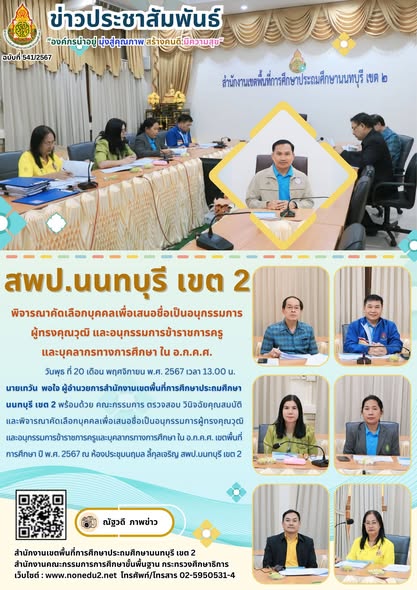 วันพุธ ที่ 20 เดือน พฤศจิกายน พ.ศ. 2567 เวลา 13.00 น. นายเทวัน พอใจ ผู้อำนวยการสำนักงานเขตพื้นที่การศึกษาประถมศึกษานนทบุรี เขต 2 พร้อมด้วย คณะกรรมการ ตรวจสอบ วินิจฉัยคุณสมบัติและพิจารณาคัดเลือกบุคคลเพื่อเสนอชื่อเป็นอนุกรรมการผู้ทรงคุณวุฒิ และอนุกรรมการข้าราชการครูและบุคลากรทางการศึกษา ใน อ.ก.ค.ศ. เขตพื้นที่การศึกษา ปี พ.ศ. 2567 ณ ห้องประชุมนฤมล ลี้กุลเจริญ สพป.นนทบุรี เขต 2