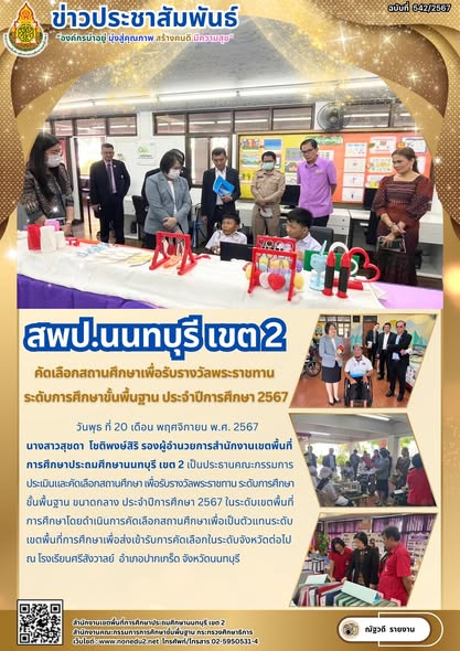 วันพุธ ที่ 20 เดือน พฤศจิกายน พ.ศ. 2567 นางสาวสุชดา โชติพงษ์สิริ รองผู้อำนวยการสำนักงานเขตพื้นที่การศึกษาประถมศึกษานนทบุรี เขต 2 เป็นประธานคณะกรรมการประเมินและคัดเลือกสถานศึกษา เพื่อรับรางวัลพระราชทาน ระดับการศึกษาขั้นพื้นฐาน ขนาดกลาง ประจำปีการศึกษา 2567 ในระดับเขตพื้นที่การศึกษาโดยดำเนินการคัดเลือกสถานศึกษาเพื่อเป็นตัวแทนระดับเขตพื้นที่การศึกษาเพื่อส่งเข้ารับการคัดเลือกในระดับจังหวัดต่อไป ณ โรงเรียนศรีสังวาลย์ อำเภอปากเกร็ด จังหวัดนนทบุรี
