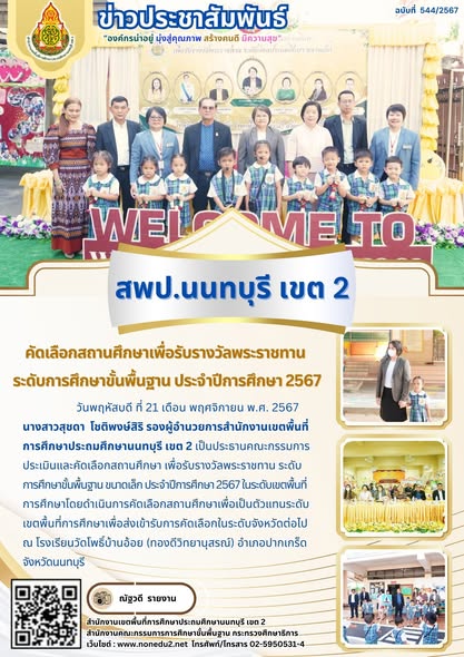 วันพฤหัสบดี ที่ 21 เดือน พฤศจิกายน พ.ศ. 2567 นางสาวสุชดา โชติพงษ์สิริ รองผู้อำนวยการสำนักงานเขตพื้นที่การศึกษาประถมศึกษานนทบุรี เขต 2 เป็นประธานคณะกรรมการประเมินและคัดเลือกสถานศึกษา เพื่อรับรางวัลพระราชทาน ระดับการศึกษาขั้นพื้นฐาน ขนาดเล็ก ประจำปีการศึกษา 2567 ในระดับเขตพื้นที่การศึกษาโดยดำเนินการคัดเลือกสถานศึกษาเพื่อเป็นตัวแทนระดับเขตพื้นที่การศึกษาเพื่อส่งเข้ารับการคัดเลือกในระดับจังหวัดต่อไป ณ โรงเรียนวัดโพธิ์บ้านอ้อย (ทองดีวิทยานุสรณ์) อำเภอปากเกร็ด จังหวัดนนทบุรี