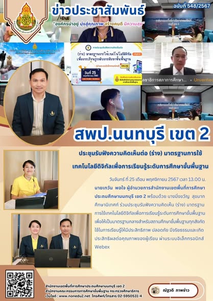 วันจันทร์ ที่ 25 เดือน พฤศจิกายน 2567 เวลา 13.00 น. นายเทวัน พอใจ ผู้อำนวยการสำนักงานเขตพื้นที่การศึกษาประถมศึกษานนทบุรี เขต 2 พร้อมด้วย นางมิ่งขวัญ สุขมาก ศึกษานิเทศก์ ร่วมประชุมรับฟังความคิดเห็น (ร่าง) มาตรฐานการใช้เทคโนโลยีดิจิทัลเพื่อการเรียนรู้ระดับการศึกษาขั้นพื้นฐานเพื่อให้เป็นมาตรฐานกลางสำหรับสถานศึกษาขั้นพื้นฐานทุกสังกัดใช้ในการเรียนรู้ให้มีประสิทธิภาพ ปลอดภัย มีจริยธรรมและเกิด