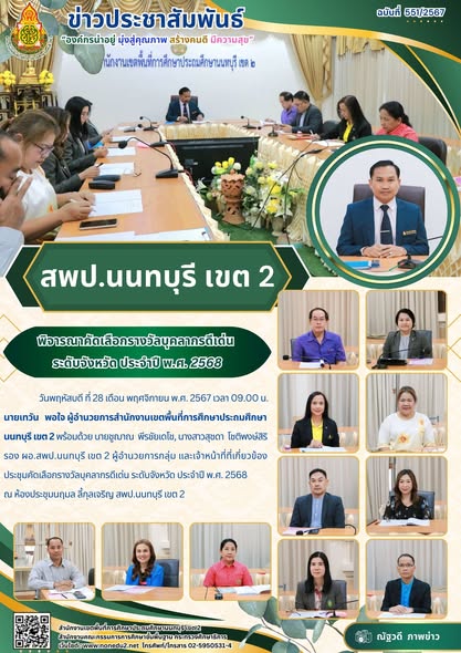 วันพฤหัสบดี ที่ 28 เดือน พฤศจิกายน พ.ศ. 2567 เวลา 09.00 น. นายเทวัน พอใจ ผู้อำนวยการสำนักงานเขตพื้นที่การศึกษาประถมศึกษานนทบุรี เขต 2 พร้อมด้วย นายชูฌาณ พีรชัยเดโช, นางสาวสุชดา โชติพงษ์สิริ รอง ผอ.สพป.นนทบุรี เขต 2 ผู้อำนวยการกลุ่ม และเจ้าหน้าที่ที่เกี่ยวข้อง ประชุมคัดเลือกรางวัลบุคลากรดีเด่น ระดับจังหวัด ประจำปี พ.ศ. 2568 ณ ห้องประชุมนฤมล ลี้กุลเจริญ สพป.นนทบุรี เขต 2