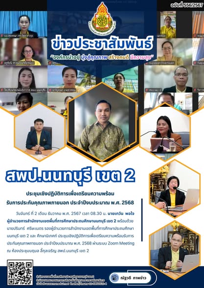 วันจันทร์ ที่ 2 เดือน ธันวาคม พ.ศ. 2567 เวลา 08.30 น. นายเทวัน พอใจ ผู้อำนวยการสำนักงานเขตพื้นที่การศึกษาประถมศึกษานนทบุรี เขต 2 พร้อมด้วย นายปรินทร์ ศรีษะเนตร รองผู้อำนวยการสำนักงานเขตพื้นที่การศึกษาประถมศึกษานนทบุรี เขต 2 และ ศึกษานิเทศก์ ประชุมเชิงปฏิบัติการเพื่อเตรียมความพร้อมรับการประกันคุณภาพภายนอก ประจำปีงบประมาณ พ.ศ. 2568 ผ่านระบบ Zoom Meeting ณ ห้องประชุมนฤมล ลี้กุลเจริญ สพป.นนทบุรี เขต 2
