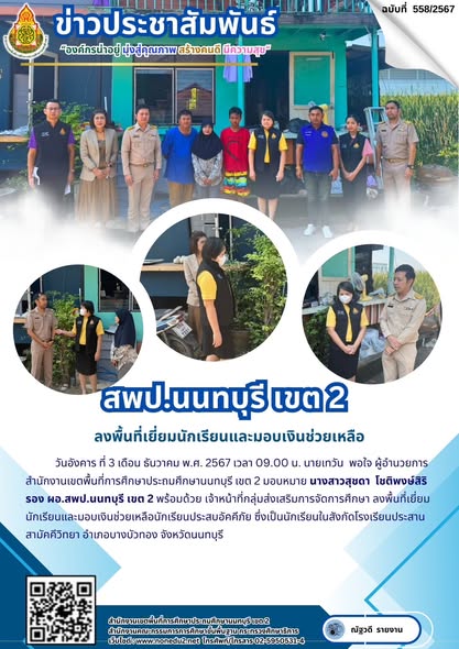 วันอังคาร ที่ 3 เดือน ธันวาคม พ.ศ. 2567 เวลา 09.00 น. นายเทวัน พอใจ ผู้อำนวยการสำนักงานเขตพื้นที่การศึกษาประถมศึกษานนทบุรี เขต 2 มอบหมาย นางสาวสุชดา โชติพงษ์สิริ รอง ผอ.สพป.นนทบุรี เขต 2 พร้อมด้วย เจ้าหน้าที่กลุ่มส่งเสริมการจัดการศึกษา ลงพื้นที่เยี่ยมนักเรียนและมอบเงินช่วยเหลือนักเรียนประสบอัคคีภัย ซึ่งเป็นนักเรียนในสังกัดโรงเรียนประสานสามัคคีวิทยา อำเภอบางบัวทอง จังหวัดนนทบุรี