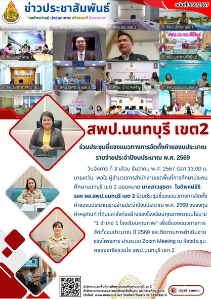วันอังคาร ที่ 3 เดือน ธันวาคม พ.ศ. 2567 เวลา 13.00 น. นายเทวัน พอใจ ผู้อำนวยการสำนักงานเขตพื้นที่การศึกษาประถมศึกษานนทบุรี เขต 2 มอบหมาย นางสาวสุชดา โชติพงษ์สิริ รอง ผอ.สพป.นนทบุรี เขต 2 ร่วมประชุมชี้แจงแนวทางการจัดตั้งคำของบประมาณรายจ่ายประจำปีงบประมาณ พ.ศ. 2569 งบลงทุน ค่าครุภัณฑ์ ที่ดินและสิ่งก่อสร้างของโรงเรียนคุณภาพตามนโยบาย “1 อำเภอ 1 โรงเรียนคุณภาพ” เพื่อชี้แจงแนวทางการจัดตั้งงบประมาณ ปี 2569 และติดตามการดำเนินงานของโครงการ ผ่านระบบ Zoom Meeting ณ ห้องประชุมคลองเกลือรวมใจ สพป.นนทบุรี เขต 2