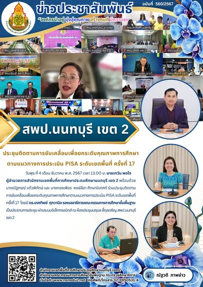 วันพุธ ที่ 4 เดือน ธันวาคม พ.ศ. 2567 เวลา 13.00 น. นายเทวัน พอใจ ผู้อำนวยการสำนักงานเขตพื้นที่การศึกษาประถมศึกษานนทบุรี เขต 2 พร้อมด้วย นางณัฐภรณ์ แก้วพิทักษ์ และ นางทองเพียร หงษ์สีลา ศึกษานิเทศก์ ร่วมประชุมติดตามการขับเคลื่อนเพื่อยกระดับคุณภาพการศึกษาตามแนวทางการประเมิน PISA ระดับเขตพื้นที่ ครั้งที่ 17 โดยมี ดร.เกศทิพย์ ศุภวานิช รองเลขาธิการคณะกรรมการการศึกษาขั้นพื้นฐาน เป็นประธานการประชุม ผ่านระบบอิเล็กทรอนิกส์ ณ ห้องประชุมนฤมล ลี้กุลเจริญ สพป.นนทบุรี เขต 2