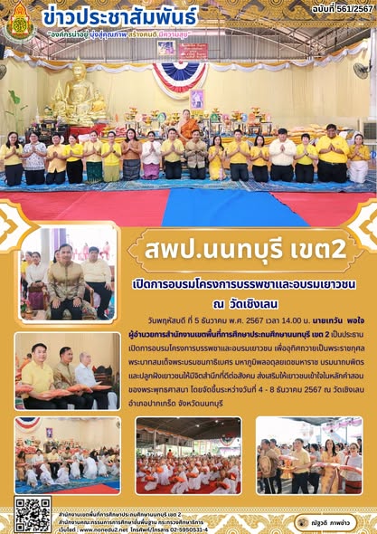 วันพฤหัสบดี ที่ 5 ธันวาคม พ.ศ. 2567 เวลา 14.00 น. นายเทวัน พอใจ ผู้อำนวยการสำนักงานเขตพื้นที่การศึกษาประถมศึกษานนทบุรี เขต 2 เป็นประธาน เปิดการอบรมโครงการบรรพชาและอบรมเยาวชน เพื่ออุทิศถวายเป็นพระราชกุศล พระบาทสมเด็จพระบรมชนกาธิเบศร มหาภูมิพลอดุลยเดชมหาราช บรมนาถบพิตร และปลูกฝังเยาวชนให้มีจิตสำนึกที่ดีต่อสังคม ส่งเสริมให้เยาวชนเข้าใจในหลักคำสอนของพระพุทธศาสนา โดยจัดขึ้นระหว่างวันที่ 4 – 8 ธันวาคม 2567 ณ วัดเชิงเลน อำเภอปากเกร็ด จังหวัดนนทบุรี
