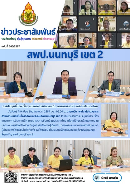 วันจันทร์ ที่ 9 เดือน ธันวาคม พ.ศ. 2567 เวลา 09.00 น. นายเทวัน พอใจ ผู้อำนวยการสำนักงานเขตพื้นที่การศึกษาประถมศึกษานนทบุรี เขต 2 เป็นประธานการประชุมชี้แจง เรื่อง แนวทางการติดตามเด็ก ตามมาตรการขับเคลื่อนประเทศไทย เพื่อแก้ปัญหาเด็กและเยาวชนนอกระบบการศึกษาให้กลายเป็นศูนย์ เพื่อให้ความรู้เกี่ยวกับ มาตรการและแนวทางการดำเนินงานแก่ผู้อำนวยการโรงเรียนในสังกัดทั้ง 63 โรงเรียน ผ่านระบบอิเล็กทรอนิกส์ ณ ห้องประชุมนฤมล ลี้กุลเจริญ สพป.นนทบุรี เขต 2