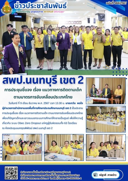 วันจันทร์ ที่ 9 เดือน ธันวาคม พ.ศ. 2567 เวลา 13.30 น. นายเทวัน พอใจ ผู้อำนวยการสำนักงานเขตพื้นที่การศึกษาประถมศึกษานนทบุรี เขต 2 เป็นประธานการประชุมชี้แจง เรื่อง แนวทางการติดตามเด็ก ตามมาตรการขับเคลื่อนประเทศไทย เพื่อแก้ปัญหาเด็กและเยาวชนนอกระบบการศึกษาให้กลายเป็นศูนย์ เพื่อให้ความรู้เกี่ยวกับ ระบบ Obec Zero Dropout แก่ครูผู้รับผิดชอบทั้ง 63 โรงเรียน ณ ห้องประชุมนนทคุณพิพัฒน์ สพป.นนทบุรี เขต 2