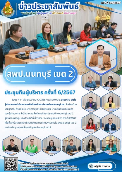 วันพุธ ที่ 11 เดือน ธันวาคม พ.ศ. 2567 เวลา 09.00 น. นายเทวัน พอใจ ผู้อำนวยการสำนักงานเขตพื้นที่การศึกษาประถมศึกษานนทบุรี เขต 2 พร้อมด้วย นายชูฌาณ พีรชัยเดโช, นางสาวสุชดา โชติพงษ์สิริ, นายปรินทร์ ศรีษะเนตร รองผู้อำนวยการสำนักงานเขตพื้นที่การศึกษาประถมศึกษานนทบุรี เขต 2 ผู้อำนวยการกลุ่ม และเจ้าหน้าที่ที่เกี่ยวข้อง ร่วมประชุมทีมบริหาร ครั้งที่ 6/2567เพื่อชี้แจงข้อราชการ พร้อมติดตามการดำเนินงานภายใน สพป.นนทบุรี เขต 2 ณ ห้องประชุมนฤมล ลี้กุลเจริญ สพป.นนทบุรี เขต 2