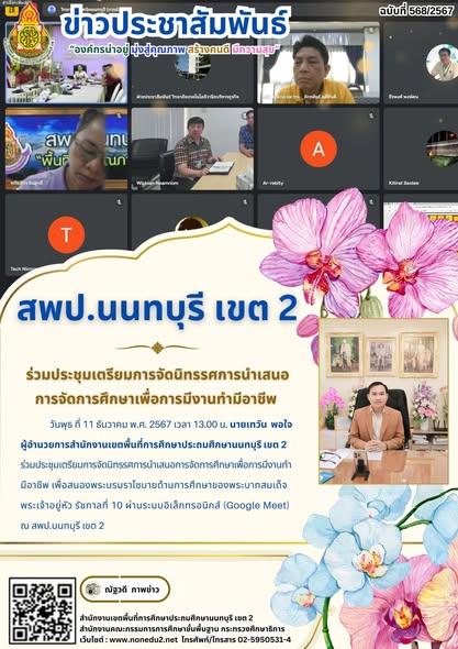 วันพุธ ที่ 11 ธันวาคม พ.ศ. 2567 เวลา 13.00 น. นายเทวัน พอใจ ผู้อำนวยการสำนักงานเขตพื้นที่การศึกษาประถมศึกษานนทบุรี เขต 2 ร่วมประชุมเตรียมการจัดนิทรรศการนำเสนอการจัดการศึกษาเพื่อการมีงานทำ มีอาชีพ เพื่อสนองพระบรมราโชบายด้านการศึกษาของพระบาทสมเด็จพระเจ้าอยู่หัว รัชกาลที่ 10 ผ่านระบบอิเล็กทรอนิกส์ (Google Meet) ณ สพป.นนทบุรี เขต 2