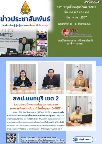 วันจันทร์ ที่ 16 เดือน ธันวาคม พ.ศ. 2567 เวลา 09.00 น. นายเทวัน พอใจ ผู้อำนวยการสำนักงานเขตพื้นที่การศึกษาประถมศึกษานนทบุรี เขต 2 พร้อมด้วย นางณัฐภรณ์ แก้วพิทักษ์ และ นางศิริวิภา สุหร่าย ศึกษานิเทศก์ ร่วมประชุมชี้แจงศูนย์สอบการเตรียมความพร้อมการทดสอบทางการศึกษาระดับชาติขั้นพื้นฐาน (O-NET) ครั้งที่ 2 ปีการศึกษา 2567 โดยสถาบันทดสอบทางการศึกษาแห่งชาติ (องค์การมหาชน) (สทศ) ผ่านระบบ Zoom Meeting ณ ห้องประชุมนฤมล ลี้กุลเจริญ สพป.นนทบุรี เขต 2