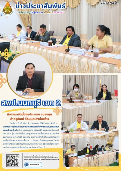 วันจันทร์ ที่ 16 เดือน ธันวาคม พ.ศ. 2567 เวลา 13.30 น. นายเทวัน พอใจ ผู้อำนวยการสำนักงานเขตพื้นที่การศึกษาประถมศึกษานนทบุรี เขต 2 พร้อมด้วย นางสาวสุชดา โชติพงษ์สิริ รอง ผอ.สพป.นนทบุรี เขต 2 และ ผู้มีส่วนเกี่ยวข้อง ประชุมพิจารณาจัดตั้งงบประมาณ ประจำปีงบประมาณ พ.ศ. 2569 งบลงทุน รายค่าครุภัณฑ์ ที่ดินและสิ่งก่อสร้างของโรงเรียนคุณภาพตามนโยบาย “1 อำเภอ 1 โรงเรียนคุณภาพ” ให้กับโรงเรียนที่มีความจำเป็นขาดแคลนครุภัณฑ์ อาคารเรียนและสิ่งก่อสร้าง ณ ห้องประชุมนฤมล ลี้กุลเจริญ สพป.นนทบุรี เขต 2