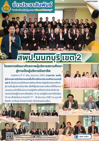 วันอังคาร ที่ 17 เดือน ธันวาคม 2567 นายเทวัน พอใจ ผู้อำนวยการสำนักงานเขตพื้นที่การศึกษาประถมศึกษานนทบุรี เขต 2 เป็นประธานเปิดโครงการพัฒนาศักยภาพผู้บริหารสถานศึกษาสู่การเป็นผู้บริหารมืออาชีพ เพื่อให้ผู้บริหารสถานศึกษาที่ได้รับการบรรจุและแต่งตั้งใหม่สามารถปฏิบัติงานได้อย่างมีประสิทธิภาพประกอบด้วยผู้อำนวยการโรงเรียน 14 คน รองผู้อำนวยการโรงเรียน 10 คน ซึ่งจัดขึ้นระหว่างวันที่ 17 – 18 ธันวาคม 2567 ณ ภูวนาลีรีสอร์ท เขาใหญ่ อำเภอปากช่อง จังหวัดนครราชสีมา