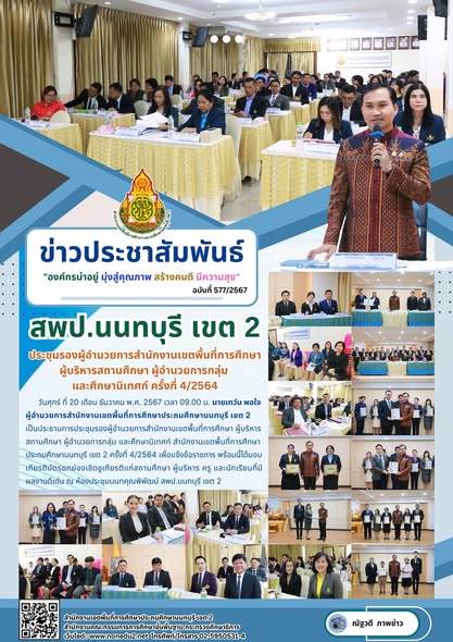 วันศุกร์ ที่ 20 เดือน ธันวาคม พ.ศ. 2567 เวลา 09.00 น. นายเทวัน พอใจ ผู้อำนวยการสำนักงานเขตพื้นที่การศึกษาประถมศึกษานนทบุรี เขต 2 เป็นประธานการประชุมรองผู้อำนวยการสำนักงานเขตพื้นที่การศึกษา ผู้บริหารสถานศึกษา ผู้อำนวยการกลุ่ม และศึกษานิเทศก์ สำนักงานเขตพื้นที่การศึกษาประถมศึกษานนทบุรี เขต 2 ครั้งที่ 4/2564 เพื่อแจ้งข้อราชการ พร้อมนี้ได้มอบเกียรติบัตรยกย่องเชิดชูเกียรติแก่สถานศึกษา ผู้บริหาร ครู และนักเรียนที่มีผลงานดีเด่น ณ ห้องประชุมนนทคุณพิพัฒน์ สพป.นนทบุรี เขต 2