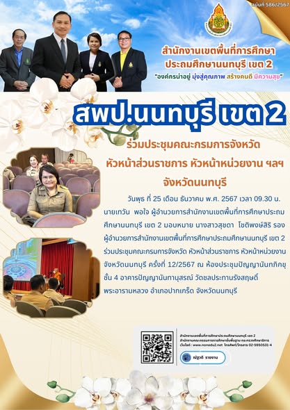 วันพุธ ที่ 25 เดือน ธันวาคม พ.ศ. 2567 เวลา 09.30 น. นายเทวัน พอใจ ผู้อำนวยการสำนักงานเขตพื้นที่การศึกษาประถมศึกษานนทบุรี เขต 2 มอบหมาย นางสาวสุชดา โชติพงษ์สิริ รองผู้อำนวยการสำนักงานเขตพื้นที่การศึกษาประถมศึกษานนทบุรี เขต 2 ร่วมประชุมคณะกรมการจังหวัด หัวหน้าส่วนราชการ หัวหน้าหน่วยงาน จังหวัดนนทบุรี ครั้งที่ 12/2567 ณ ห้องประชุมปัญญานันทภิกขุ ชั้น 4 อาคารปัญญานันทานุสรณ์ วัดชลประทานรังสฤษดิ์ พระอารามหลวง อำเภอปากเกร็ด จังหวัดนนทบุรี
