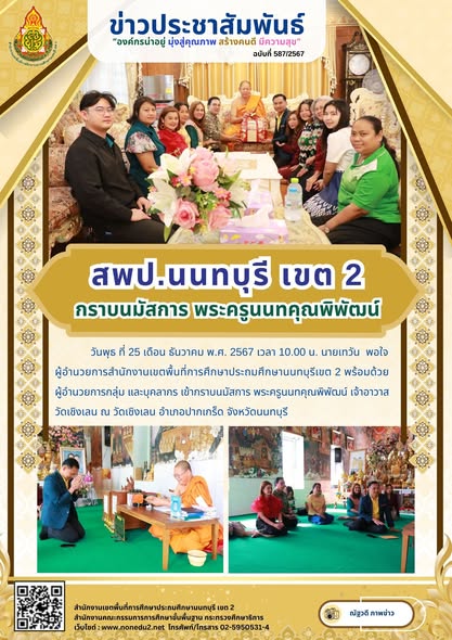 วันพุธ ที่ 25 เดือน ธันวาคม พ.ศ. 2567 เวลา 10.00 น. นายเทวัน พอใจ ผู้อำนวยการสำนักงานเขตพื้นที่การศึกษาประถมศึกษานนทบุรีเขต 2 พร้อมด้วย ผู้อำนวยการกลุ่ม และบุคลากร เข้ากราบนมัสการ พระครูนนทคุณพิพัฒน์ เจ้าอาวาสวัดเชิงเลน ณ วัดเชิงเลน อำเภอปากเกร็ด จังหวัดนนทบุรี