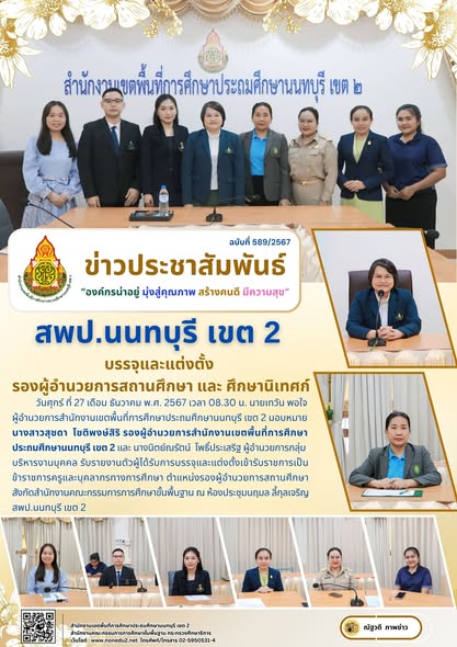 วันศุกร์ ที่ 27 เดือน ธันวาคม พ.ศ. 2567 เวลา 08.30 น. นายเทวัน พอใจ ผู้อำนวยการสำนักงานเขตพื้นที่การศึกษาประถมศึกษานนทบุรี เขต 2 มอบหมาย นางสาวสุชดา โชติพงษ์สิริ รองผู้อำนวยการสำนักงานเขตพื้นที่การศึกษาประถมศึกษานนทบุรี เขต 2 และ นางนิตย์ณรัตน์ โพธิ์ประเสริฐ ผู้อำนวยการกลุ่มบริหารงานบุคคล รับรายงานตัวผู้ได้รับการบรรจุและแต่งตั้งเข้ารับราชการเป็นข้าราชการครูและบุคลากรทางการศึกษา ตำแหน่งรองผู้อำนวยการสถานศึกษาสังกัดสำนักงานคณะกรรมการการศึกษาขั้นพื้นฐาน ณ ห้องประชุมนฤมล ลี้กุลเจริญ สพป.นนทบุรี เขต 2