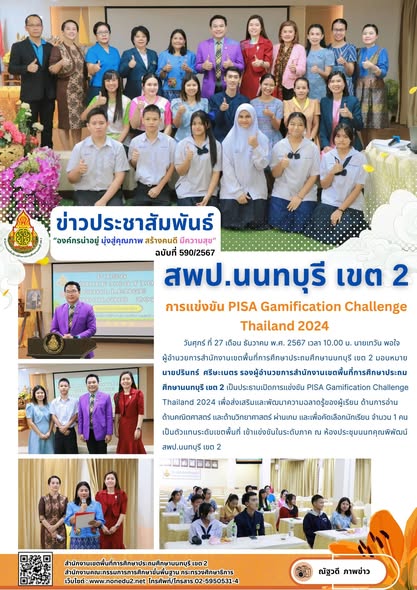 วันศุกร์ ที่ 27 เดือน ธันวาคม พ.ศ. 2567 เวลา 10.00 น. นายเทวัน พอใจ ผู้อำนวยการสำนักงานเขตพื้นที่การศึกษาประถมศึกษานนทบุรี เขต 2 มอบหมาย นายปรินทร์ ศรีษะเนตร รองผู้อำนวยการสำนักงานเขตพื้นที่การศึกษาประถมศึกษานนทบุรี เขต 2 เป็นประธานเปิดการแข่งขัน PISA Gamification Challenge Thailand 2024 เพื่อส่งเสริมและพัฒนาความฉลาดรู้ของผู้เรียน ด้านการอ่าน ด้านคณิตศาสตร์ และด้านวิทยาศาสตร์ ผ่านเกม และเพื่อคัดเลือกนักเรียน จำนวน 1 คน เป็นตัวแทนระดับเขตพื้นที่ เข้าแข่งขันในระดับภาค ณ ห้องประชุมนนทคุณพิพัฒน์ สพป.นนทบุรี เขต 2