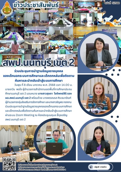 วันพุธ ที่ 8 เดือน มกราคม พ.ศ. 2568 เวลา 14.00 น. นายเทวัน พอใจ ผู้อำนวยการสำนักงานเขตพื้นที่การศึกษาประถมศึกษานนทบุรี เขต 2 มอบหมาย นางสาวสุชดา โชติพงษ์สิริ รอง ผอ.สพป.นนทบุรี เขต 2 พร้อมด้วย นางพรรณรส ศิระธนารัณฑ์ ผู้อำนวยการกลุ่มส่งเสริมการจัดการศึกษา และนางสาวธัญพร ทองงาม ร่วมประชุมการนำฐานข้อมูลรายบุคคลของเด็กนอกระบบการศึกษาและเด็กตกหล่นเพื่อติดตามค้นหาและนำกลับเข้าสู่ระบบการศึกษา ผ่านระบบ Zoom Meeting ณ ห้องประชุมนฤมล ลี้กุลเจริญ สพป.นนทบุรี เขต 2