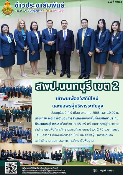 วันพฤหัสบดี ที่ 9 เดือน มกราคม 2568 เวลา 10.00 น. นายเทวัน พอใจ ผู้อำนวยการสำนักงานเขตพื้นที่การศึกษาประถมศึกษานนทบุรี เขต 2 พร้อมด้วย นายปรินทร์ ศรีษะเนตร รองผู้อำนวยการสำนักงานเขตพื้นที่การศึกษาประถมศึกษานนทบุรี เขต 2 ผู้อำนวยการกลุ่ม และ บุคลากร เข้าพบเพื่อสวัสดีปีใหม่ และขอพรผู้บริหารระดับสูง ณ สำนักงานคณะกรรมการการศึกษาขั้นพื้นฐาน