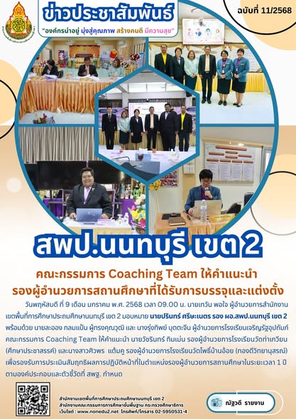วันพฤหัสบดี ที่ 9 เดือน มกราคม พ.ศ. 2568 เวลา 09.00 น. นายเทวัน พอใจ ผู้อำนวยการสำนักงานเขตพื้นที่การศึกษาประถมศึกษานนทบุรี เขต 2 มอบหมาย นายปรินทร์ ศรีษะเนตร รอง ผอ.สพป.นนทบุรี เขต 2 พร้อมด้วย นายละออง กลมแป้น ผู้ทรงคุณวุฒิ และ นางรุ่งทิพย์ บุตตะจีน ผู้อำนวยการโรงเรียนเจริญรัฐอุปถัมภ์ คณะกรรมการ Coaching Team ให้คำแนะนำ นายวัชรินทร์ ทิมเม่น รองผู้อำนวยการโรงเรียนวัดท่าเกวียน(ศึกษาประชาสรรค์) และนางสาวศิวพร แต้มคู รองผู้อำนวยการโรงเรียนวัดโพธิ์บ้านอ้อย (ทองดีวิทยานุสรณ์) เพื่อรองรับการประเมินสัมฤทธิผลการปฏิบัติหน้าที่ในตำแหน่งรองผู้อำนวยการสถานศึกษาในระยะเวลา 1 ปี ตามองค์ประกอบและตัวชี้วัดที่ สพฐ. กำหนด