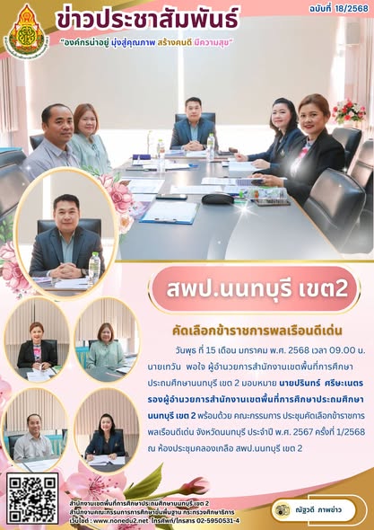 วันพุธ ที่ 15 เดือน มกราคม พ.ศ. 2568 เวลา 09.00 น. นายเทวัน พอใจ ผู้อำนวยการสำนักงานเขตพื้นที่การศึกษาประถมศึกษานนทบุรี เขต 2 มอบหมาย นายปรินทร์ ศรีษะเนตร รองผู้อำนวยการสำนักงานเขตพื้นที่การศึกษาประถมศึกษานนทบุรี เขต 2 พร้อมด้วย คณะกรรมการ ประชุมคัดเลือกข้าราชการพลเรือนดีเด่น จังหวัดนนทบุรี ประจำปี พ.ศ. 2567 ครั้งที่ 1/2568 ณ ห้องประชุมคลองเกลือ สพป.นนทบุรี เขต 2
