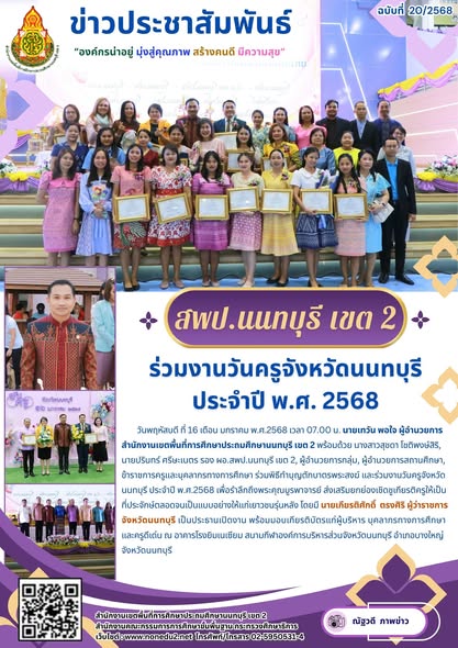 วันพฤหัสบดี ที่ 16 เดือน มกราคม พ.ศ.2568 เวลา 07.00 น. นายเทวัน พอใจ ผู้อำนวยการสำนักงานเขตพื้นที่การศึกษาประถมศึกษานนทบุรี เขต 2 พร้อมด้วย นางสาวสุชดา โชติพงษ์สิริ, นายปรินทร์ ศรีษะเนตร รอง ผอ.สพป.นนทบุรี เขต 2, ผู้อำนวยการกลุ่ม, ผู้อำนวยการสถานศึกษา, ข้าราชการครูและบุคลากรทางการศึกษา ร่วมพิธีทำบุญตักบาตรพระสงฆ์ และร่วมงานวันครูจังหวัดนนทบุรี ประจำปี พ.ศ.2568 เพื่อรำลึกถึงพระคุณบูรพาจารย์ ส่งเสริมยกย่องเชิดชูเกียรติครูให้เป็นที่ประจักษ์ตลอดจนเป็นแบบอย่างให้แก่เยาวชนรุ่นหลัง โดยมี นายเกียรติศักดิ์ ตรงศิริ ผู้ว่าราชการจังหวัดนนทบุรี เป็นประธานเปิดงาน พร้อมมอบเกียรติบัตรแก่ผู้บริหาร บุคลากรทางการศึกษาและครูดีเด่น ณ อาคารโรงยิมเนเซียม สนามกีฬาองค์การบริหารส่วนจังหวัดนนทบุรี อำเภอบางใหญ่ จังหวัดนนทบุรี