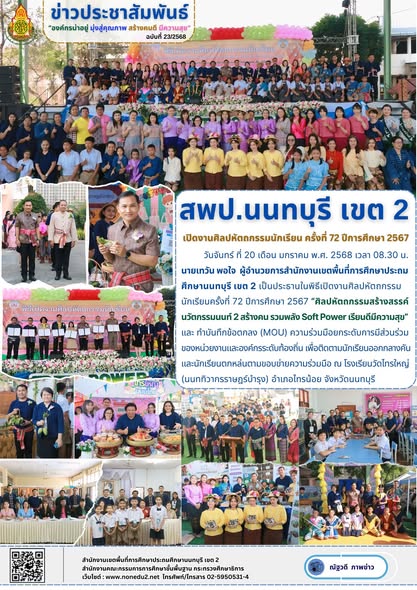 วันจันทร์ ที่ 20 เดือน มกราคม พ.ศ. 2568 เวลา 08.30 น. นายเทวัน พอใจ ผู้อำนวยการสำนักงานเขตพื้นที่การศึกษาประถมศึกษานนทบุรี เขต 2 เป็นประธานในพิธีเปิดงานศิลปหัตถกรรมนักเรียนครั้งที่ 72 ปีการศึกษา 2567 “ศิลปหัตถกรรมสร้างสรรค์ นวัตกรรมนนท์ 2 สร้างคน รวมพลัง Soft Power เรียนดีมีความสุข” และ ทำบันทึกข้อตกลง (MOU) ความร่วมมือยกระดับการมีส่วนร่วมของหน่วยงานและองค์กรระดับท้องถิ่น เพื่อติดตามนักเรียนออกกลางคันและนักเรียนตกหล่นตามขอบข่ายความร่วมมือ ณ โรงเรียนวัดไทรใหญ่ (นนททิวากรราษฎร์บำรุง) อำเภอไทรน้อย จังหวัดนนทบุรี