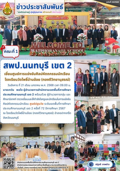 วันอังคาร ที่ 21 เดือน มกราคม พ.ศ. 2568 เวลา 09.00 น. นายเทวัน พอใจ ผู้อำนวยการสำนักงานเขตพื้นที่การศึกษาประถมศึกษานนทบุรี เขต 2 พร้อมด้วย ผู้อำนวยการกลุ่ม และศึกษานิเทศก์ ตรวจเยี่ยมและให้กำลังใจครูและนักเรียนในการแข่งขันศิลปหัตถกรรมนักเรียน ศูนย์ปฐมวัย ระดับเขตพื้นที่การศึกษาประถมศึกษานนทบุรี เขต 2 ครั้งที่ 72 ปีการศึกษา 2567 ณ โรงเรียนวัดโพธิ์บ้านอ้อย (ทองดีวิทยานุสรณ์) อำเภอปากเกร็ด จังหวัดนนทบุรี
