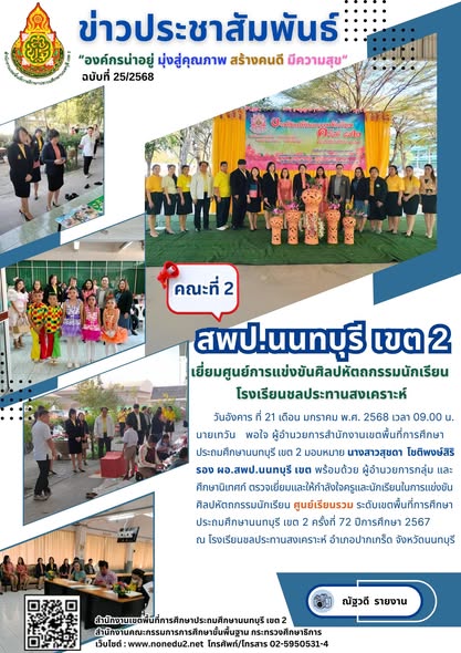 วันอังคาร ที่ 21 เดือน มกราคม พ.ศ. 2568 เวลา 09.00 น. นายเทวัน พอใจ ผู้อำนวยการสำนักงานเขตพื้นที่การศึกษาประถมศึกษานนทบุรี เขต 2 มอบหมาย นางสาวสุชดา โชติพงษ์สิริ รอง ผอ.สพป.นนทบุรี เขต พร้อมด้วย ผู้อำนวยการกลุ่ม และศึกษานิเทศก์ ตรวจเยี่ยมและให้กำลังใจครูและนักเรียนในการแข่งขันศิลปหัตถกรรมนักเรียน ศูนย์เรียนรวม ระดับเขตพื้นที่การศึกษาประถมศึกษานนทบุรี เขต 2 ครั้งที่ 72 ปีการศึกษา 2567 ณ โรงเรียนชลประทานสงเคราะห์ อำเภอปากเกร็ด จังหวัดนนทบุรี