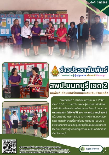 วันพฤหัสบดี ที่ 23 เดือน มกราคม พ.ศ. 2568 เวลา 13.30 น. นายเทวัน พอใจ ผู้อำนวยการสำนักงานเขตพื้นที่การศึกษาประถมศึกษานนทบุรี เขต 2 มอบหมาย นางสาวสุชดา โชติพงษ์สิริ รอง ผอ.สพป.นนทบุรี เขต 2 พร้อมด้วย ผู้อำนวยการกลุ่ม และเจ้าหน้าที่กลุ่มส่งเสริมการจัดการศึกษาลงพื้นที่เยี่ยมนักเรียนและมอบเงินช่วยเหลือนักเรียนประสบอุบัติเหตุ ซึ่งเป็นนักเรียนในสังกัดโรงเรียนวัดสพานสูง (รถไฟนุเคราะห์) ณ อำเภอปากเกร็ด จังหวัดนนทบุรี