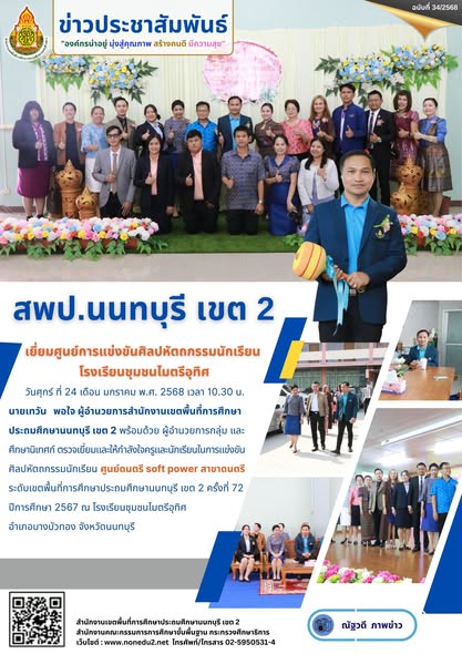 วันศุกร์ ที่ 24 เดือน มกราคม พ.ศ. 2568 เวลา 10.30 น. นายเทวัน พอใจ ผู้อำนวยการสำนักงานเขตพื้นที่การศึกษาประถมศึกษานนทบุรี เขต 2 พร้อมด้วย ผู้อำนวยการกลุ่ม และศึกษานิเทศก์ ตรวจเยี่ยมและให้กำลังใจครูและนักเรียนในการแข่งขันศิลปหัตถกรรมนักเรียน ศูนย์ดนตรี soft power สาขาดนตรี ระดับเขตพื้นที่การศึกษาประถมศึกษานนทบุรี เขต 2 ครั้งที่ 72 ปีการศึกษา 2567 ณ โรงเรียนชุมชนไมตรีอุทิศ อำเภอบางบัวทอง จังหวัดนนทบุรี