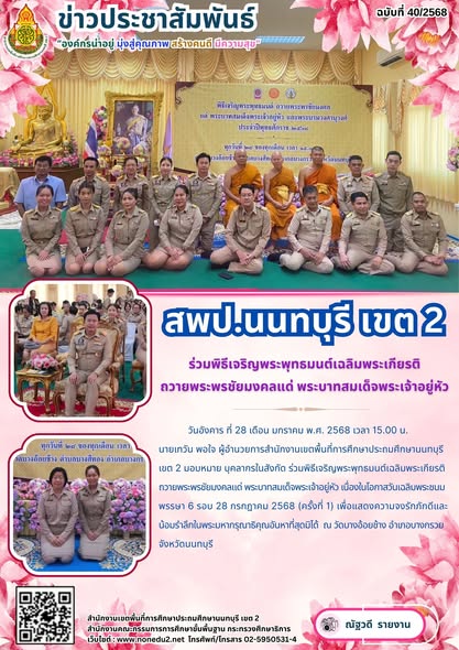 วันอังคาร ที่ 28 เดือน มกราคม พ.ศ. 2568 เวลา 15.00 น. นายเทวัน พอใจ ผู้อำนวยการสำนักงานเขตพื้นที่การศึกษาประถมศึกษานนทบุรี เขต 2 มอบหมาย บุคลากรในสังกัด ร่วมพิธีเจริญพระพุทธมนต์เฉลิมพระเกียรติ ถวายพระพรชัยมงคลแด่ พระบาทสมเด็จพระเจ้าอยู่หัว เนื่องในโอกาสวันเฉลิมพระชนมพรรษา 6 รอบ 28 กรกฎาคม 2568 (ครั้งที่ 1) เพื่อแสดงความจงรักภักดีและน้อมรำลึกในพระมหากรุณาธิคุณอันหาที่สุดมิได้ ณ วัดบางอ้อยช้าง อำเภอบางกรวย จังหวัดนนทบุรี