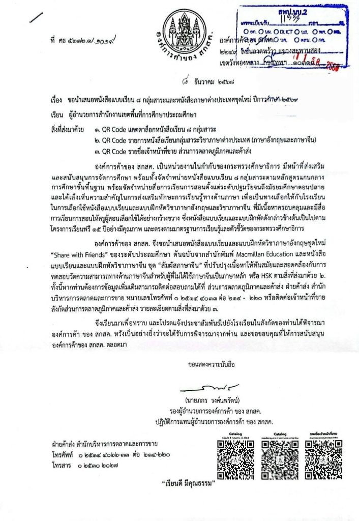 องค์การค้าของสกสค. ขอนำเสนอหนังสือแบบเรียนและแบบฝึกหัดวิชาภาษาอังกฤษชุดใหม่ ของระดับประถมศึกษา รายละเอียดตามเอกสารแนบ