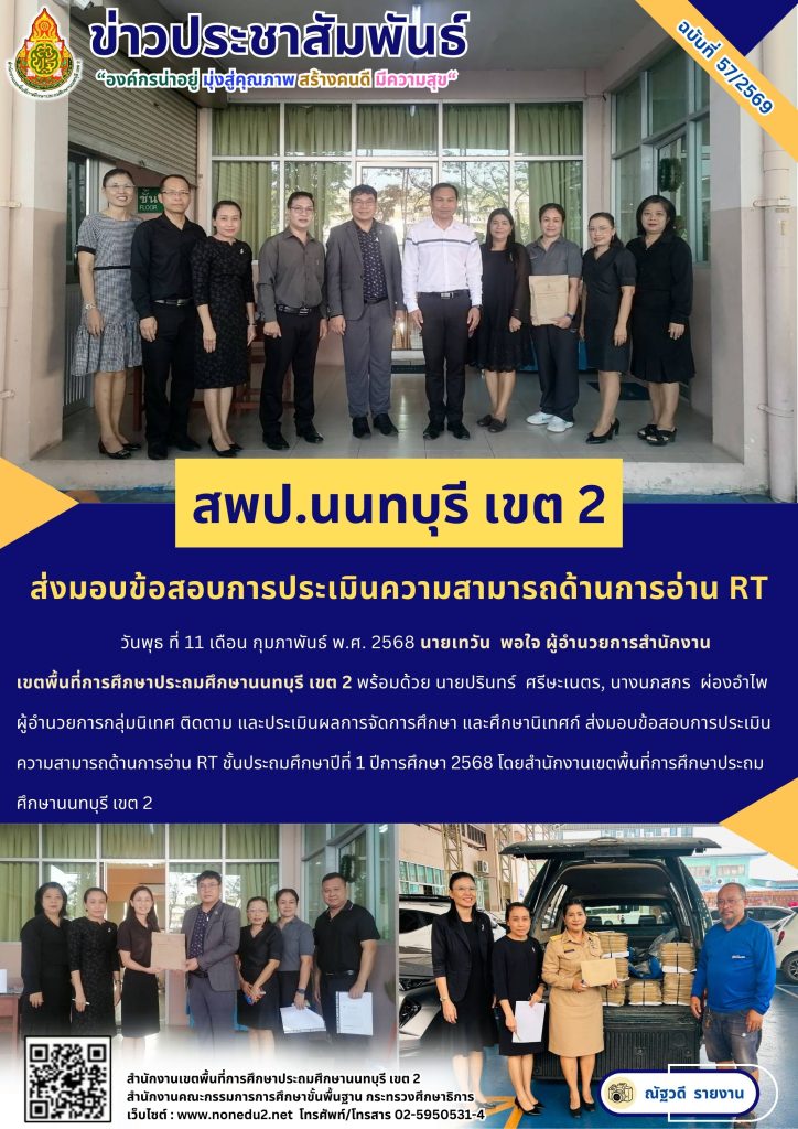 วันพุธ ที่ 11 เดือน กุมภาพันธ์ พ.ศ. 2568 นายเทวัน พอใจ ผู้อำนวยการสำนักงานเขตพื้นที่การศึกษาประถมศึกษานนทบุรี เขต 2 พร้อมด้วย นายปรินทร์ ศรีษะเนตร, นางนภสกร ผ่องอำไพ ผู้อำนวยการกลุ่มนิเทศ ติดตาม และประเมินผลการจัดการศึกษา และศึกษานิเทศก์ ส่งมอบข้อสอบการประเมินความสามารถด้านการอ่าน RT ชั้นประถมศึกษาปีที่ 1 ปีการศึกษา 2568 โดยสำนักงานเขตพื้นที่การศึกษาประถมศึกษานนทบุรี เขต 2