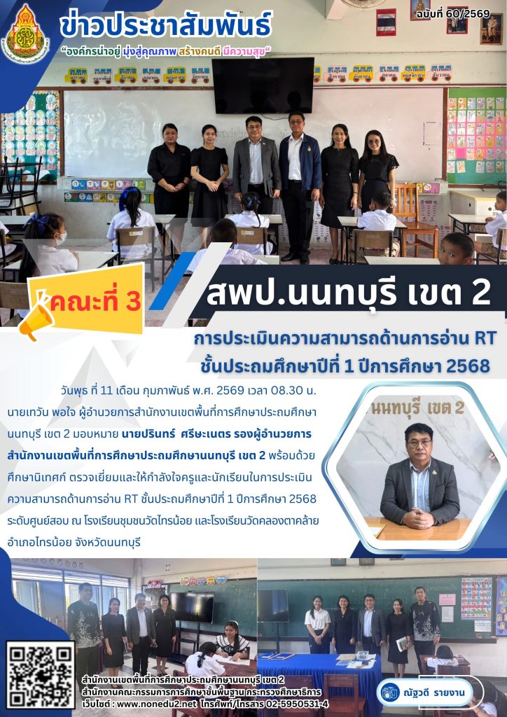 วันพุธ ที่ 11 เดือน กุมภาพันธ์ พ.ศ. 2569 เวลา 08.30 น. นายเทวัน พอใจ ผู้อำนวยการสำนักงานเขตพื้นที่การศึกษาประถมศึกษานนทบุรี เขต 2 มอบหมาย นายปรินทร์ ศรีษะเนตร รองผู้อำนวยการสำนักงานเขตพื้นที่การศึกษาประถมศึกษานนทบุรี เขต 2 พร้อมด้วย ศึกษานิเทศก์ ตรวจเยี่ยมและให้กำลังใจครูและนักเรียนในการประเมินความสามารถด้านการอ่าน RT ชั้นประถมศึกษาปีที่ 1 ปีการศึกษา 2568 ระดับศูนย์สอบ ณ โรงเรียนชุมชนวัดไทรน้อย และโรงเรียนวัดคลองตาคล้าย อำเภอไทรน้อย จังหวัดนนทบุรี