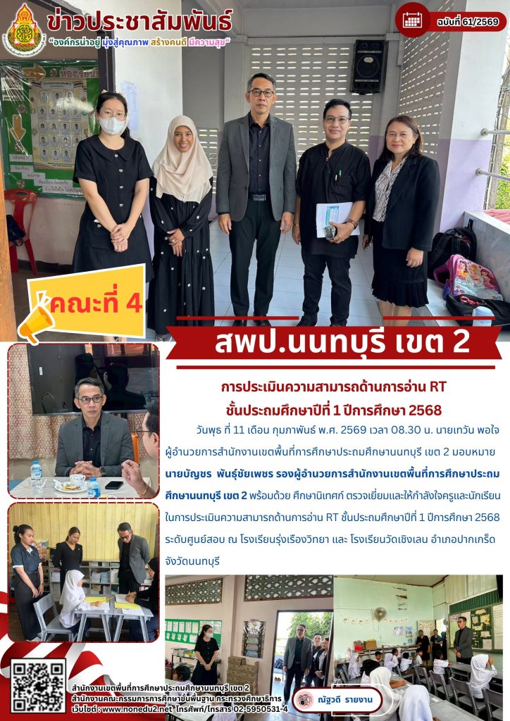 วันพุธ ที่ 11 เดือน กุมภาพันธ์ พ.ศ. 2569 เวลา 08.30 น. นายเทวัน พอใจ ผู้อำนวยการสำนักงานเขตพื้นที่การศึกษาประถมศึกษานนทบุรี เขต 2 มอบหมาย นายบัญชร พันธุ์ชัยเพชร รองผู้อำนวยการสำนักงานเขตพื้นที่การศึกษาประถมศึกษานนทบุรี เขต 2 พร้อมด้วย ศึกษานิเทศก์ ตรวจเยี่ยมและให้กำลังใจครูและนักเรียนในการประเมินความสามารถด้านการอ่าน RT ชั้นประถมศึกษาปีที่ 1 ปีการศึกษา 2568 ระดับศูนย์สอบ ณ โรงเรียนรุ่งเรืองวิทยา และ โรงเรียนวัดเชิงเลน อำเภอปากเกร็ด จังวัดนนทบุรี