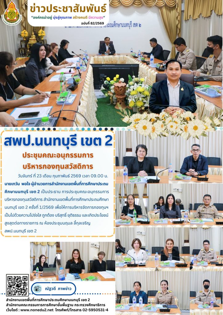 วันจันทร์ ที่ 23 เดือน กุมภาพันธ์ 2569 เวลา 09.00 น. นายเทวัน พอใจ ผู้อำนวยการสำนักงานเขตพื้นที่การศึกษาประถมศึกษานนทบุรี เขต 2 เป็นประธาน การประชุมคณะอนุกรรมการบริหารกองทุนสวัสดิการ สำนักงานเขตพื้นที่การศึกษาประถมศึกษานนทบุรี เขต 2 ครั้งที่ 1/2569 เพื่อให้การบริหารจัดการกองทุนฯ เป็นไปด้วยความโปร่งใส ถูกต้อง บริสุทธิ์ ยุติธรรม และเกิดประโยชน์สูงสุดต่อทางราชการ ณ ห้องประชุมนฤมล ลี้กุลเจริญ สพป.นนทบุรี เขต 2