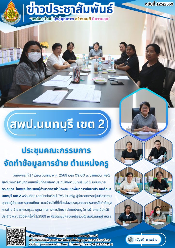 วันอังคาร ที่ 17 เดือน มีนาคม พ.ศ. 2569 เวลา 09.00 น. นายเทวัน พอใจ ผู้อำนวยการสำนักงานเขตพื้นที่การศึกษาประถมศึกษานนทบุรี เขต 2 มอบหมาย ดร.สุชดา โชติพงษ์สิริ รองผู้อำนวยการสำนักงานเขตพื้นที่การศึกษาประถมศึกษานนทบุรี เขต 2 พร้อมด้วย นายนิตย์ณรัตน์ โพธิ์ประเสริฐ ผู้อำนวยการกลุ่มบริหารงานบุคคล ผู้อำนวยการสถานศึกษา และเจ้าหน้าที่ที่เกี่ยวข้อง ประชุมคณะกรรมการจัดทำข้อมูลการย้าย ข้าราชการครูและบุคลากรทางการศึกษา ตำแหน่งครู (การย้ายกรณีปกติ) ประจำปี พ.ศ. 2569 ครั้งที่ 1/2569 ณ ห้องประชุมคลองเกลือรวมใจ สพป.นนทบุรี เขต 2