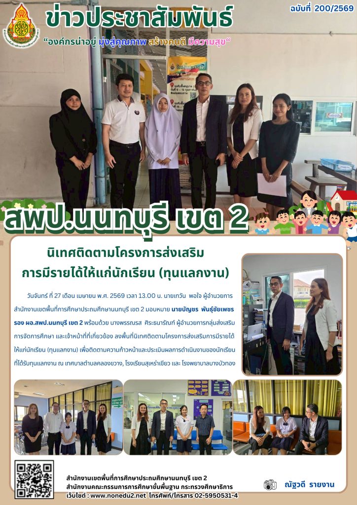 วันจันทร์ ที่ 27 เดือน เมษายน พ.ศ. 2569 เวลา 13.00 น. นายเทวัน พอใจ ผู้อำนวยการสำนักงานเขตพื้นที่การศึกษาประถมศึกษานนทบุรี เขต 2 มอบหมาย นายบัญชร พันธุ์ชัยเพชร รอง ผอ.สพป.นนทบุรี เขต 2 พร้อมด้วย นางพรรณรส ศิระธนารัณฑ์ ผู้อำนวยการกลุ่มส่งเสริมการจัดการศึกษา และเจ้าหน้าที่ที่เกี่ยวข้อง ลงพื้นที่นิเทศติดตามโครงการส่งเสริมการมีรายได้ให้แก่นักเรียน (ทุนแลกงาน) เพื่อติดตามความก้าวหน้าและประเมินผลการดำเนินงานของนักเรียนที่ได้รับทุนแลกงาน ณ เทศบาลตำบลคลองขวาง, โรงเรียนสุเหร่าเขียว และ โรงพยาบาลบางบัวทอง