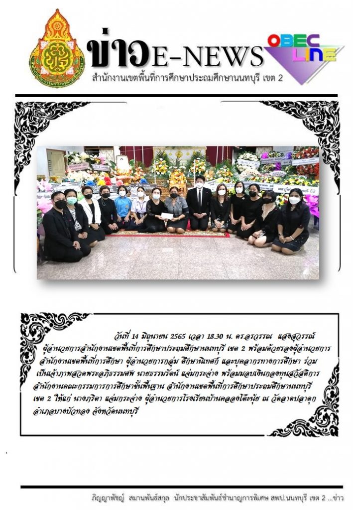 วันที่ 14 มิถุนายน 2565 มอบเงินกองทุนสวัสดิการสำนักงานคณะกรรมการการศึกษาขั้นพื้นฐาน สำนักงานเขตพื้นที่การศึกษาประถมศึกษานนทบุรี เขต 2 Leave a Comment / ข่าวกิจกรรม / By กลุ่มอำนวยการ