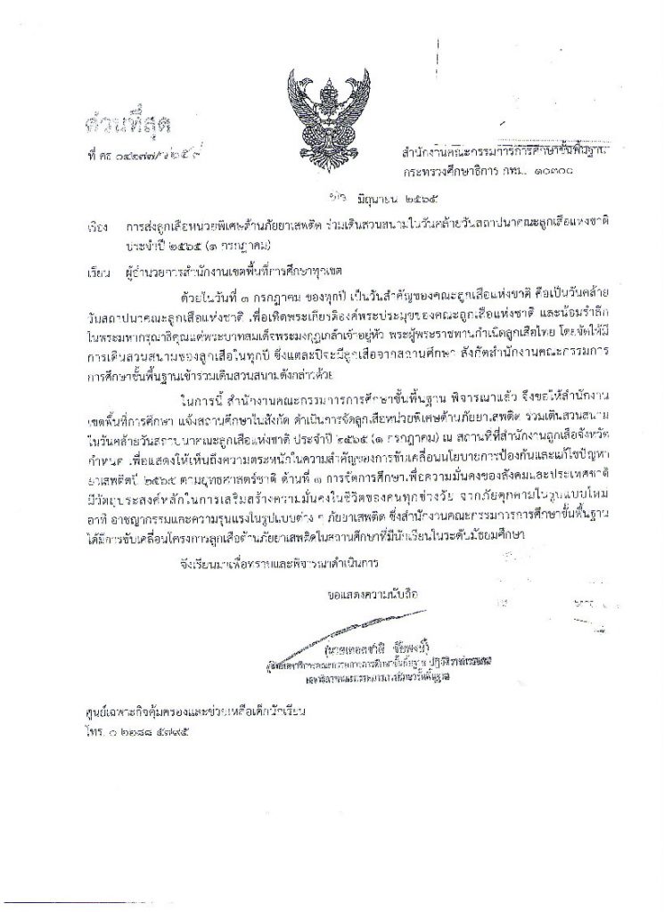 ด้วยวันที่ 1 กรกฎาคม ของทุกปี เป็นวันสำคัญคณะลูกเสือแห่งชาติ คือเป็นวันคล้ายวันสถานปนาคณะลูกเสือห่งชาติ เพื่อเทิดพระเกียรติองค์พระประมุขของคณะลูกเสือแห่งชาติ และน้อมรำลึกในพระมหากรุณาธิคุณแค่พระบาทสมเด็จพระมงกุฏเกล้าเจ้าอยู่หัว พระผู้พระราชทานกำเนิดลูกเสือไทย ในการนี้สำนักงานเขตพื้นที่การศึกษาประถมศึกษานนทบุรี เขต 2 จึงขอเชิญชวนสถา่นศึกษาในสังกัดดำเนินการจัดลูกเสือหน่วยพิเศษต้านภายยาเสพติดร่วมเดินสวนสนามในวันคล้ายวันสถาปนาคณะลูกเสือแห่งชาติ ประจำปี 2565 (1กรกฎาคม) ณ สถานที่ที่สำนักงานลูกเสือจังหวัด