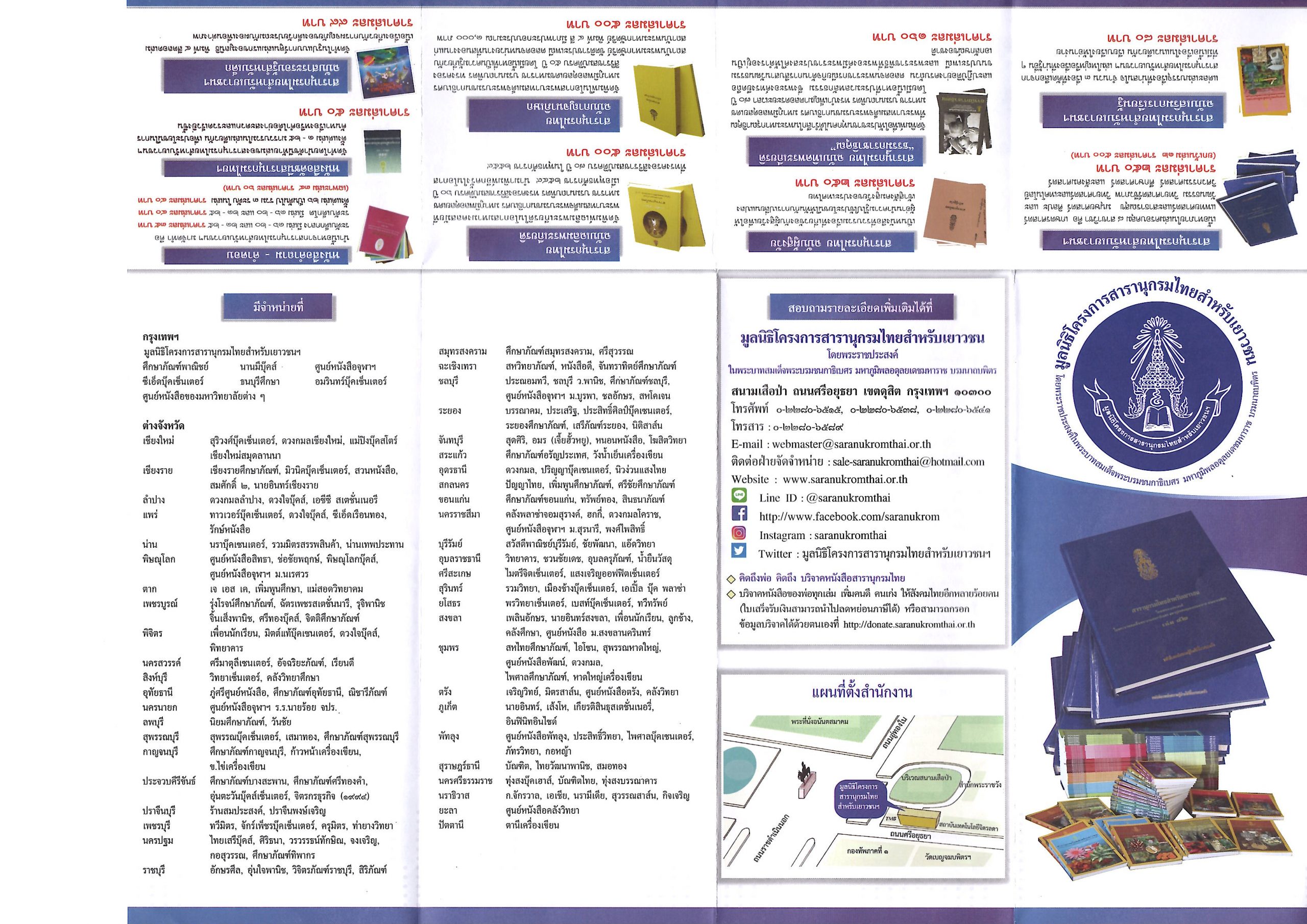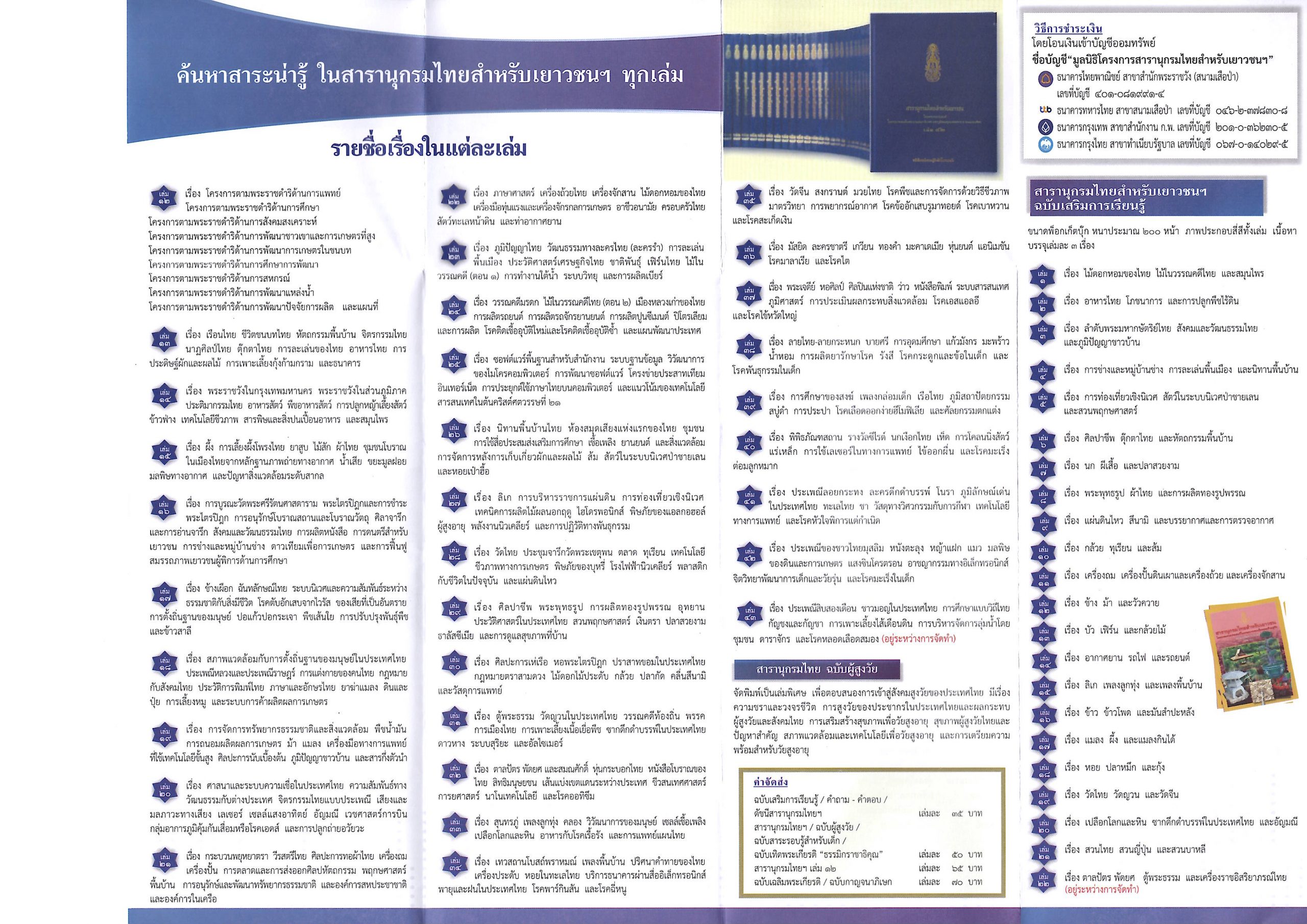 มูลนิธิโครงการสารานุกรมไทยสำหรับเยาวชน เชิญชวนสั่งซื้อสารานุกรมไทย เล่มที่ 37-42 และสารานุกรมไทยสำหรับเยาวชน ฉบับเสริมการเรียนรู้ เล่มที่ 1-21 ติดต่อ นางสาวจันทิมา คงคาหลวง 022806515 , 022806541 ต่อ 105