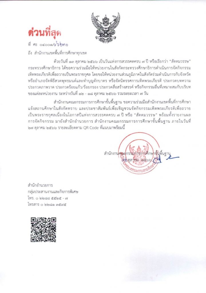 ด้วยวันที่ 13 ตุลาคม 2566 เป็นวันแห่งการสวรรคต ครบรอบ 7 ปี หรือเรียกว่า “สัตตมวรรษ” กระทรวงศึกษาขอให้จัดกิจกรรมเทิดพระเกียรติเพื่อถวายเป็นพระราชกุศล เนื่องในโอกาสปีแห่งการสวรรคต ครบ 7 ปี จึงให้สำนักงานคณะกรรมการการศึกษาขั้นพื้นฐานแจ้งหน่วยงานในสังกัดดำเนินการจัดกิจกรรมเทิดพระเกียรติเพื่อถวายเป็นพระราชกุศล เนื่องในโอกาสปีแห่งการสวรรคตครบ 7 ปี สำนักงานเขตพื้นทีีการศึกษาประถมศึกษาฯ จึงประชาสัมพันธ์เชิญชวนสถานศึกษา จัดกิจกรรมดังกล่่าว ดังรายละเอียด ตาม QR Cod เอกสารแนบมาพร้อมนี้