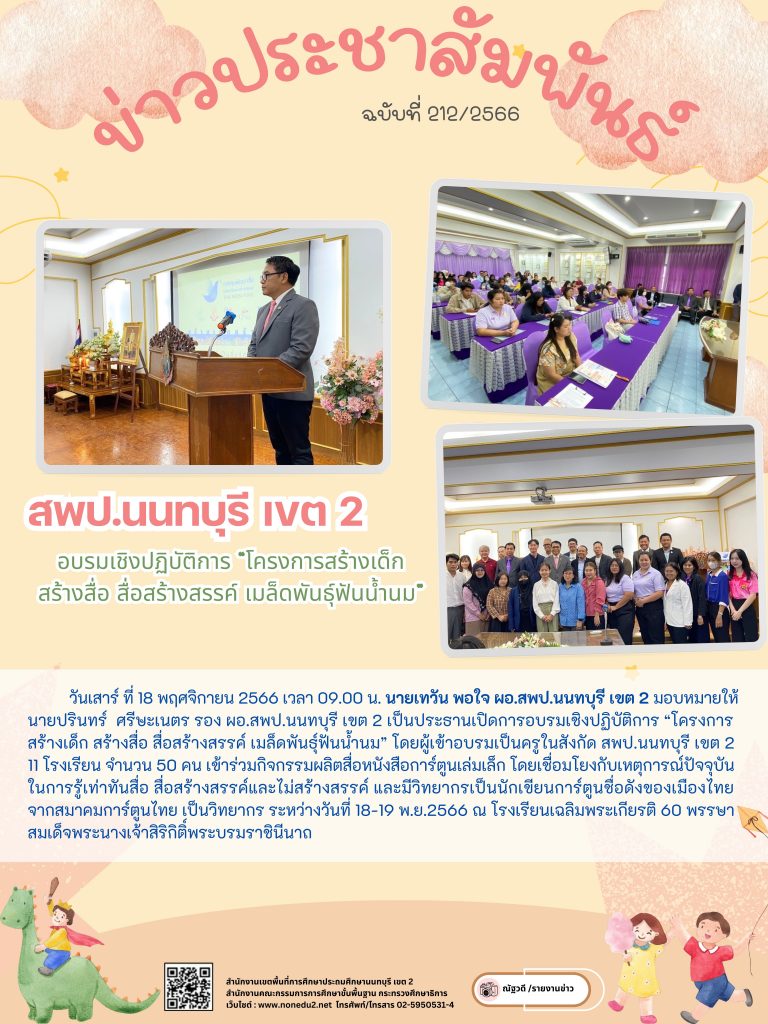 วันเสาร์ ที่ 18 พฤศจิกายน 2566 เวลา 09.00 น. นายเทวัน พอใจ ผอ.สพป.นนทบุรี เขต 2 มอบหมายให้ นายปรินทร์ ศรีษะเนตร รอง ผอ.สพป.นนทบุรี เขต 2 เป็นประธานเปิดการอบรมเชิงปฏิบัติการ “โครงการสร้างเด็ก สร้างสื่อ สื่อสร้างสรรค์ เมล็ดพันธุ์ฟันน้ำนม” โดยผู้เข้าอบรมเป็นครูในสังกัด สพป.นนทบุรี เขต 2 11 โรงเรียน จำนวน 50 คน เข้าร่วมกิจกรรมผลิตสื่อหนังสือการ์ตูนเล่มเล็ก โดยเชื่อมโยงกับเหตุการณ์ปัจจุบัน ในการรู้เท่าทันสื่อ สื่อสร้างสรรค์และไม่สร้างสรรค์ และมีวิทยากรเป็นนักเขียนการ์ตูนชื่อดังของเมืองไทย จากสมาคมการ์ตูนไทย เป็นวิทยากร ระหว่างวันที่ 18-19 พ.ย.2566 ณ โรงเรียนเฉลิมพระเกียรติ 60 พรรษา สมเด็จพระนางเจ้าสิริกิติ์พระบรมราชินีนาถ