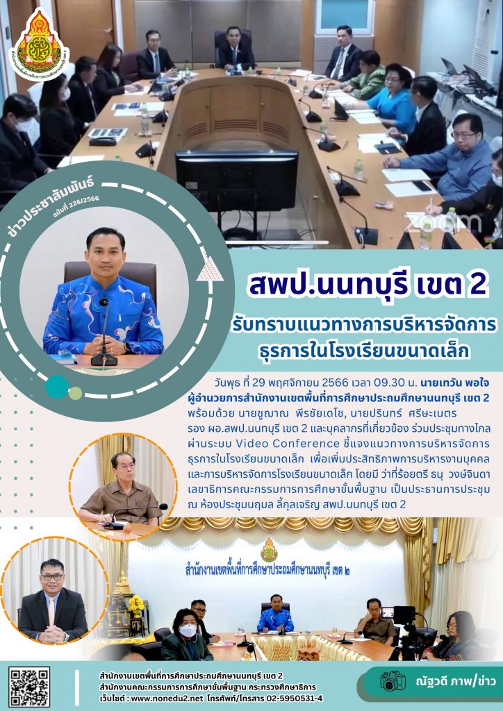 วันพุธ ที่ 29 พฤศจิกายน 2566 เวลา 09.30 น. นายเทวัน พอใจ ผู้อำนวยการสำนักงานเขตพื้นที่การศึกษาประถมศึกษานนทบุรี เขต 2 พร้อมด้วย นายชูฌาณ พีรชัยเดโช, นายปรินทร์ ศรีษะเนตร รอง ผอ.สพป.นนทบุรี เขต 2 และบุคลากรที่เกี่ยวข้อง ร่วมประชุมทางไกลผ่านระบบ Video Conference ชี้แจงแนวทางการบริหารจัดการธุรการในโรงเรียนขนาดเล็ก เพื่อเพิ่มประสิทธิภาพการบริหารงานบุคคลและการบริหารจัดการโรงเรียนขนาดเล็ก โดยมี ว่าที่ร้อยตรี ธนุ วงษ์จินดา เลขาธิการคณะกรรมการการศึกษาขั้นพื้นฐาน เป็นประธานการประชุม ณ ห้องประชุมนฤมล ลี้กุลเจริญ สพป.นนทบุรี เขต 2